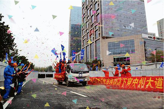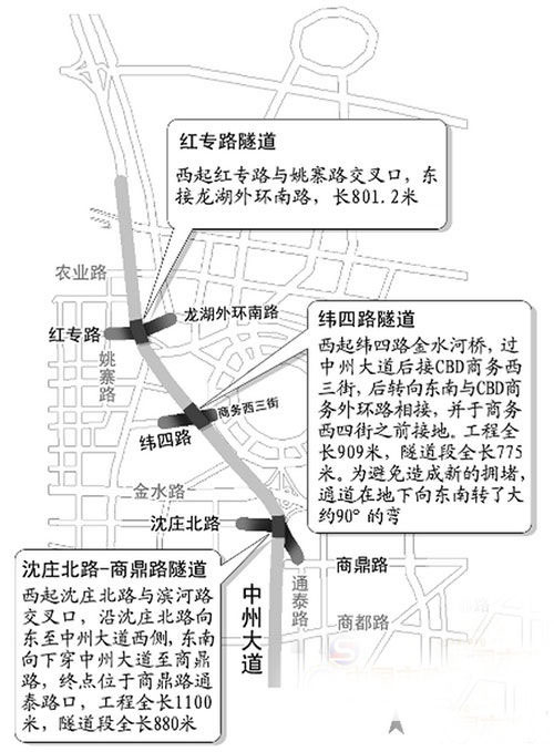2014年11月30日,鄭州緯四路下穿中州大道工程已實行單幅西向東試通車,而紅專路下穿中州大道也于次日雙向機動車道放行。預(yù)計春節(jié)前,兩個下穿通道人行道和非機動車道也將通行,鄭州金水路、中州大道和未來路等周邊道路的交通壓力將得到極大緩解。